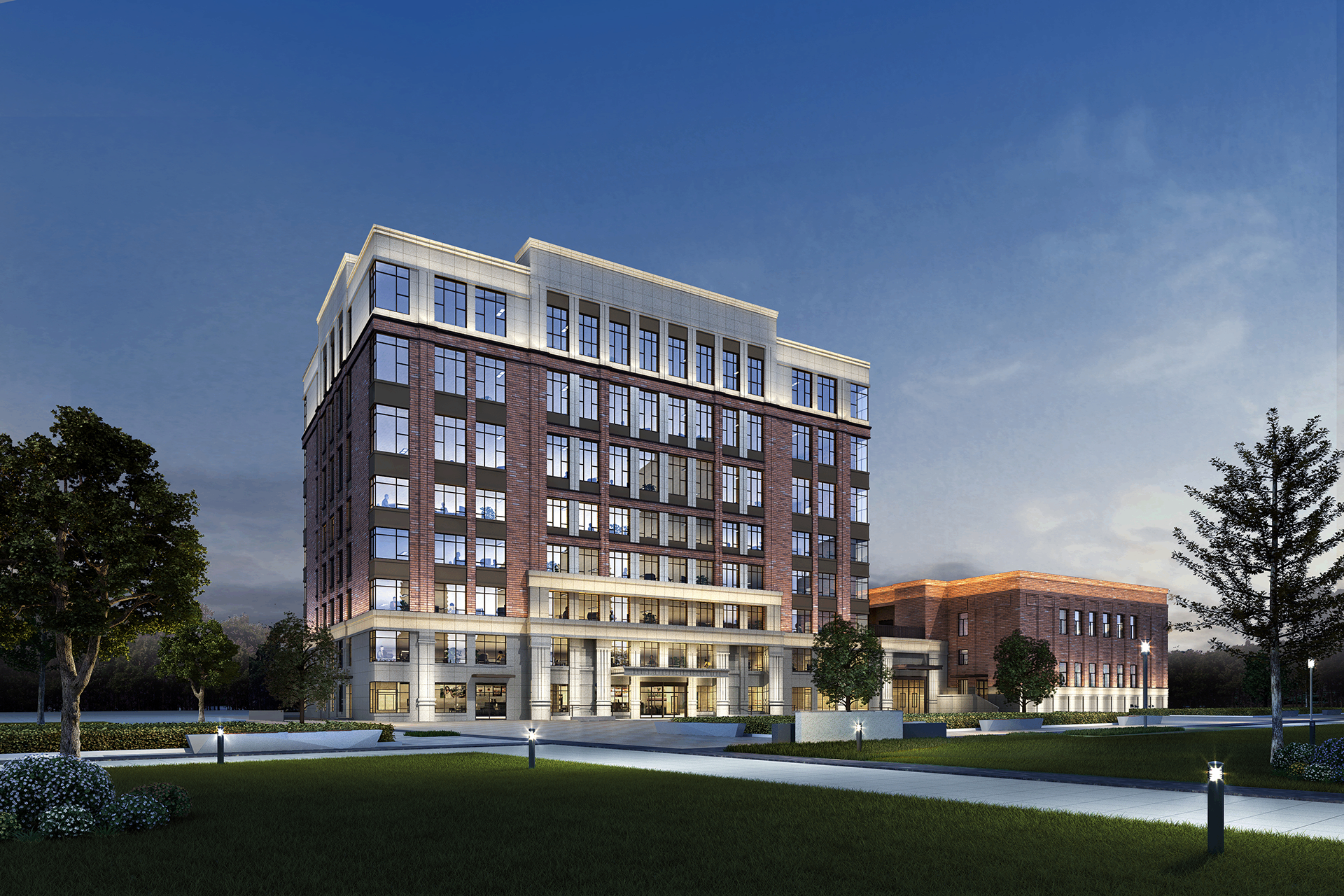 西区老年大学项目位于西海岸新区隐珠街道办事处三沙路以东,寨子山路以北。总建筑面积19053.55平方米,其中地下建筑面积3876.64平方米,地上建筑面积15176.91平方米。主要包括教学办公楼及报告厅,其中教学办公楼为地上八层,报告厅为地上两层,同时项目配套建设地下车库、综合管网、道路、广场、绿化、大门、围墙等。建筑物最大高度为39.8米,最大跨度为23.9米。