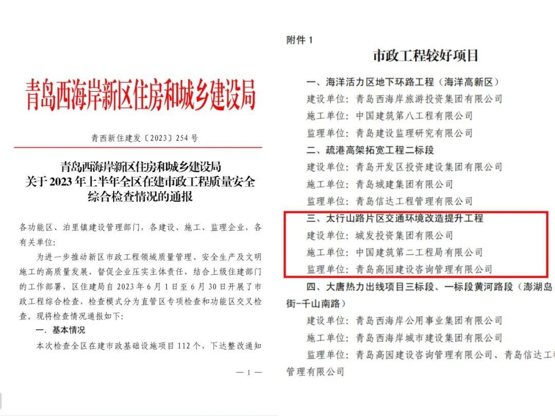 近日,青岛西海岸新区住房和城乡建设局发布《关于2023 年上半年全区在建市政工程质量安全综合检查情况的通报》,城发集团建设的太行山路片区交通环境改造提升工程因工程实体质量整体较好,安全文明施工标准化、精细化等,从本次检查的112个在建市政工程项目中脱颖而出,获评“市政工程较好太行山路片区交通环境改造提升工程南起珠江路,北至富春江路,道路全长 1045m,采用太行山路下穿长江路交通方案,工程建设内容包括道路、结构、市政管线、交通、景观及亮化、附属工程等,为省、市、区重点民生工程。该项目毗邻汽车东站、太行山路小学、建国大厦等重要建筑,是新区的重要交通节点。
