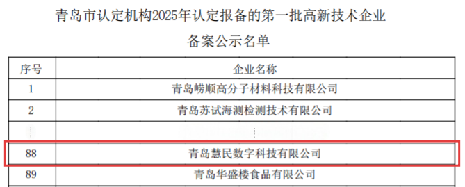 近日,全国高新技术企业认定管理工作领导小组办公室对青岛市认定机构2025年认定报备的第一批高新技术企业进行备案公示,青岛慧民数字科技有限公司凭借在核心技术研发、成果转化及产业化应用方面的突出表现,成功入选国家高新技术企业名单,跻身科技创新标杆企业行列。